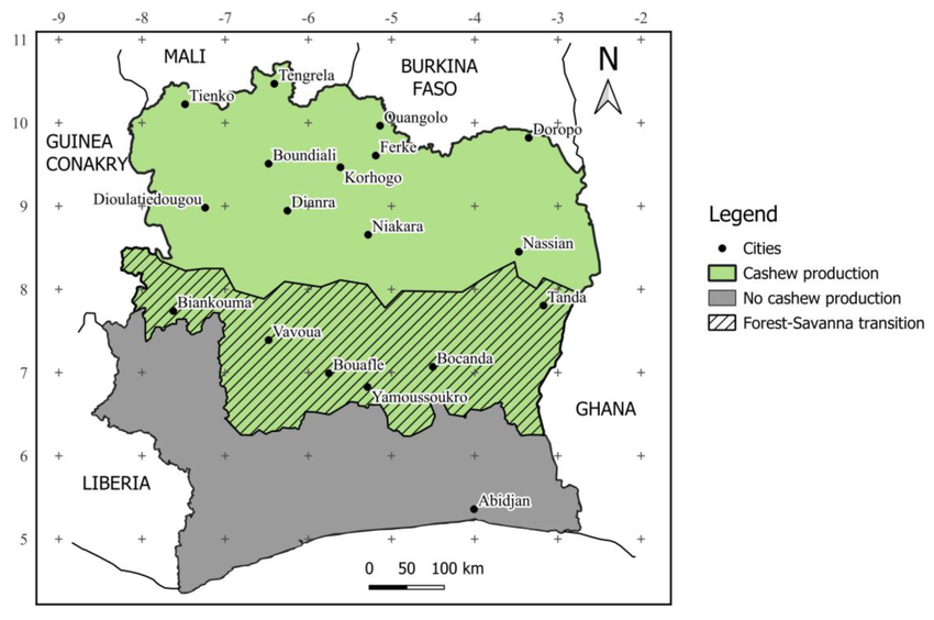 Cashews wachsen gut in einem relativ trockenen Klima. Die Hauptanbauregionen von Cashews in der Elfenbeinküste sind daher die Gebiete im Norden. Auch in der Mitte des Landes werden Cashews angebaut, im Süden dagegen gar nicht.