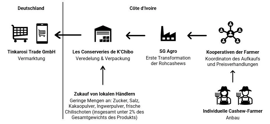Für ein Unternehmen, was fair handeln möchte, ist das Wichtigste natürlich die Rückverfolgbarkeit und das Vertrauen in die Geschäftspartner. Tinkarosi arbeitet vor Ort in der Elfenbeinküste ja in erster Linie mit dem Unternehmen “Les Conserveries de K’Chibo” zusammen. Aber K’Chibo knackt die so genannten Rohcashews nicht selbst. Die Schale der Cashew ist extrem hart und enthält das ätzende CNSL-Öl. Dies kann bei manuellem Knacken schwere Schäden an den Händen von Arbeiter:innen hinterlassen. Deswegen muss dieser erste Verarbeitungsschritt in großen Fabriken mit entsprechenden Maschinen und Sicherheitsvorkehrungen geschehen. Bisher arbeiten wir mit zwei Fabriken in der Elfenbeinküste zusammen, eine von ihnen ist SG Agro in der Stadt Yamoussoukro. Sie sind ein sehr verlässlicher Partner von K’Chibo und Tinkarosi geworden.